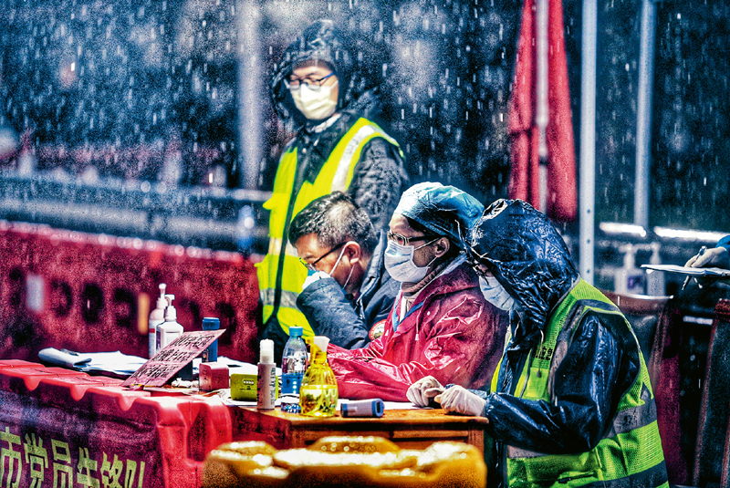 疫情暴發(fā)以來,廣東省鶴山市廣大黨員、機(jī)關(guān)干部、民警,主動放棄休假,24小時(shí)輪值堅(jiān)守崗位,全力打好疫情防控戰(zhàn),切實(shí)維護(hù)人民生命安全和身體健康。圖為2月4日凌晨,鶴山市大雨傾盆,天氣寒冷,黨員干部、醫(yī)務(wù)人員在公安民警、交通執(zhí)法等單位人員配合下,對進(jìn)入鶴山市的所有車輛人員進(jìn)行體溫檢測、詢問情況。 人民圖片 黃繼明/攝