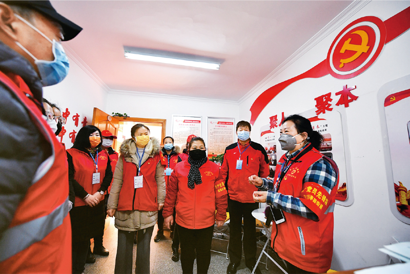 2020年2月11日,陜西省西安市蓮湖區(qū)棗園街道唐都花園社區(qū)黨支部書記姚美珍(右一)與工作人員和志愿者討論當(dāng)日分工安排。 新華社記者 張博文/攝