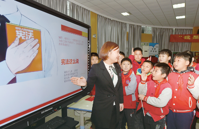 圖為2018年12月3日,安徽省合肥市經(jīng)開區(qū)明珠居委會(huì)法律援助律師在給明珠小學(xué)的學(xué)生們講解憲法知識(shí)。新華社記者 郭晨/攝