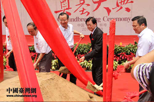 安徽省臺(tái)辦主任朱德祥、蚌埠市市長(zhǎng)周春雨、上海百樂(lè)門(mén)董事長(zhǎng)趙世崇在儀式上培土奠基(圖片來(lái)源:蚌埠市臺(tái)辦)