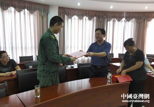 縣統(tǒng)戰(zhàn)部副部長(zhǎng)、臺(tái)辦主任洪建中向項(xiàng)凌淵頒發(fā)省臺(tái)聯(lián)表彰證書。(圖片來(lái)源:歙縣臺(tái)辦)