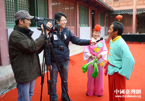 臺(tái)灣記者在蚌埠采訪表演花鼓燈的農(nóng)民。(安徽省臺(tái)辦 裔淳 攝)