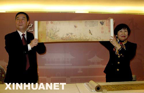 3月2日,鄭欣淼(左)與周功鑫共同展示故宮博物院贈(zèng)送的宋朝趙昌的《寫生蛺蝶圖》復(fù)制品。
