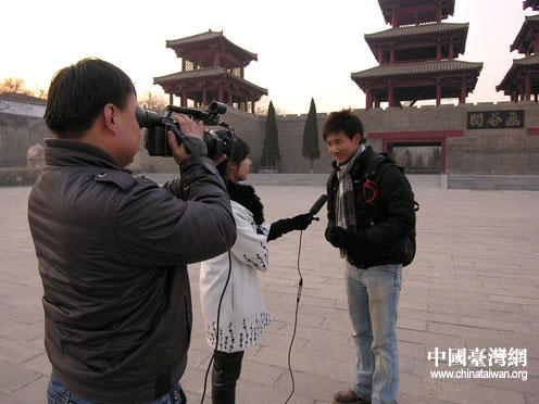 中天電視臺(tái)主持人在函谷關(guān)前接受三門峽電視臺(tái)記者的采訪。圖片來源:三門峽市臺(tái)辦