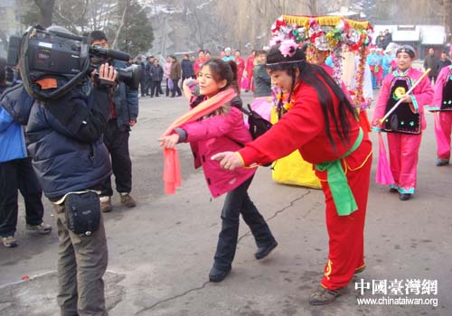 在本溪湖,臺(tái)灣記者們看到了本溪湖的非物資文化遺產(chǎn)《小推車》?吹疆(dāng)?shù)鼐用竦木饰璧副硌,臺(tái)灣中天電視臺(tái)主持人幃幃情不自禁地隨之起舞,并謙虛請(qǐng)教“小車舞”發(fā)明人,與之共舞。(中國(guó)臺(tái)灣網(wǎng)本溪市臺(tái)辦通訊員 孫秀國(guó))
