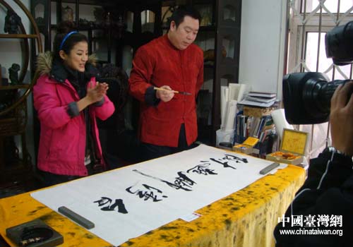 臺灣記者們專訪了遼硯傳人章永軍,了解了遼硯石材的獨特優(yōu)點,以及遼硯的藝術(shù)觀賞和珍藏價值遼硯傳人。當(dāng)代著名書法家、工藝美術(shù)大師章永軍還即興揮毫潑墨為節(jié)目組留下“臺灣腳逛大陸”墨寶贈送臺灣中天電視臺。(中國臺灣網(wǎng)本溪市臺辦通訊員 楊宏石)