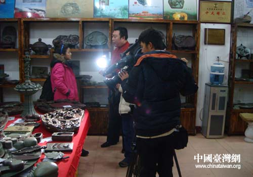 中國臺灣網(wǎng)12月27日本溪消息 22日,臺灣中天電視《臺灣腳逛大陸》節(jié)目組一行四位記來到了遼寧省本溪市遼硯最大的生產(chǎn)基地進行采訪。本溪市臺辦副主任范藝陪同采訪。