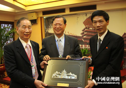 貴州省貴陽(yáng)市市長(zhǎng)李再勇(右一)向臺(tái)灣嘉賓贈(zèng)送帶有貴陽(yáng)民族特色的紀(jì)念品(貴陽(yáng)市臺(tái)辦 胡珊珊 攝)