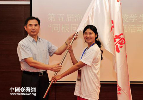 西北農(nóng)林科技大學(xué)副校長(zhǎng)侯曦會(huì)將“同根·同源”暑期交流活動(dòng)營(yíng)旗授予學(xué)生代表(圖片來源:陜西省臺(tái)辦)