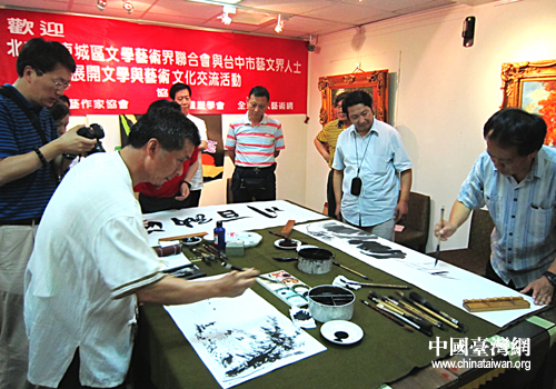 在筆會活動中,兩岸書畫家現(xiàn)場揮毫,以文會友,以筆抒情,深情傳遞了文脈相通、血脈相連的民族情誼,彰顯出中華文化歷史悠久,博大精深,歷經(jīng)波折始終未曾中斷的強大凝聚力與生命力。同時,伴隨著此次文化交流之旅,考察團還帶去了東城文藝家給臺灣同胞的親切問候與良好祝愿,雙方互贈紀念品并合影留念。