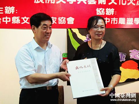 向臺中縣文藝作家協(xié)會理事長林美怡贈送《文化東城——書法美術(shù)精品集》(圖片來源:北京市臺辦)