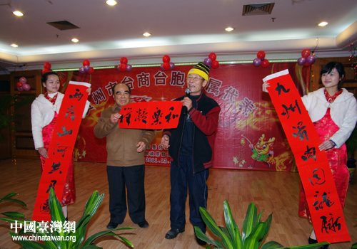 茶話會上,賀州市書法家阿三向臺商臺胞臺屬代表贈送其親自書寫的春聯(lián),并向市臺辦贈送了書法作品“兩岸一家親”。市領(lǐng)導(dǎo)向臺商臺胞臺屬代表贈送中國結(jié)將晚會推向高潮。(中國臺灣網(wǎng)、賀州市臺辦聯(lián)合報道)