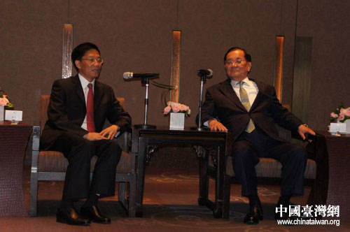 中共四川省委常委、副省長鐘勉(左)在臺(tái)北會(huì)見中國國民黨榮譽(yù)主席連戰(zhàn)(右)。 圖片來源:四川省臺(tái)辦
