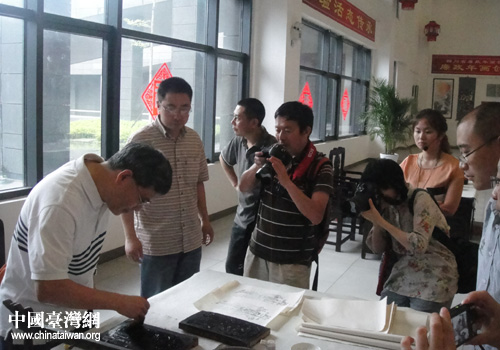 臺(tái)灣“中國(guó)時(shí)報(bào)”副總編輯黃樹德體驗(yàn)綿竹年畫上墨印線技法。(圖片來源:德陽市臺(tái)辦)