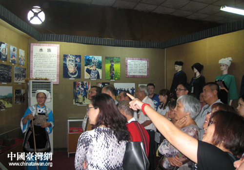 臺(tái)灣的少數(shù)民族團(tuán)員們參觀了三都水族博物館,觀看了水族的水書、服飾等民俗文化展覽,了解了當(dāng)今的水族同胞,寫水書、說(shuō)水語(yǔ)、用水歷、著水衣、唱水歌、跳水舞,傳承著淳厚的水族風(fēng)俗習(xí)慣。被譽(yù)為象形文字“活化石”的水書,至今廣為使用。水族的端節(jié)、水書、馬尾繡被列為國(guó)家級(jí)首批非物質(zhì)文化遺產(chǎn)名錄。