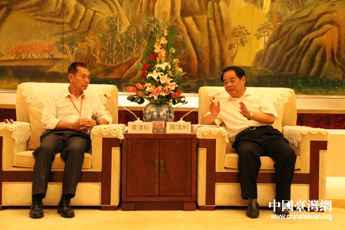 淄博市委副書記、市長周清利會見“2012海外臺商齊魯行”考察團一行,圖為周清利與來自巴西的臺商黃清標(biāo)交談。(圖片來源:淄博臺辦)