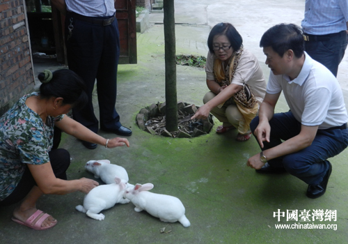 臺商金憶君(右2)與德陽市市長陳新有(右1)考察獺兔喂養(yǎng)。(圖片來源:綿竹市臺辦)