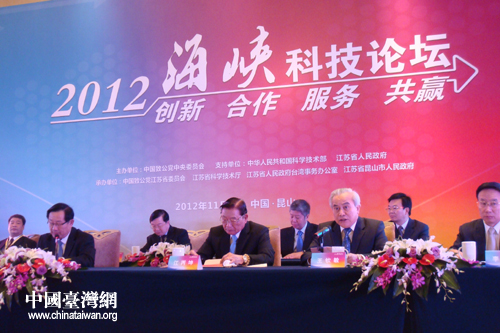 中國臺灣網(wǎng)11月5日昆山消息 日前,由中國致公黨中央委員會主辦,江蘇省科學(xué)技術(shù)廳、中國致公黨江蘇省委員會、江蘇省人民政府臺灣事務(wù)辦公室、昆山市人民政府承辦的“2012海峽科技論壇”在昆山舉行。逾300位兩岸學(xué)術(shù)界、科技界和產(chǎn)業(yè)界人士,圍繞“創(chuàng)新、合作、服務(wù)、共贏”主題共同探討加強(qiáng)兩岸科技創(chuàng)新合作。全國政協(xié)副主席、致公黨中央主席、科技部部長萬鋼,臺灣三三會會長、;鶗岸麻L江丙坤,江蘇省副省長何權(quán),海峽兩岸關(guān)系協(xié)會執(zhí)行副會長兼秘書長李亞飛出席論壇并致辭。