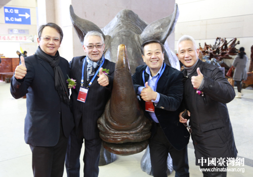 嘉賓們在威海文博會現(xiàn)場銅制犀牛前合影。(威海市臺辦 王建利 攝)