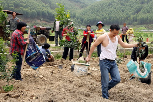 當(dāng)天,春光明媚,蘇宮村的黨員和村民早已在田間忙碌起來(lái),區(qū)臺(tái)辦干部職工改變以往的下村到村委會(huì)走走,開(kāi)座談會(huì)的方式,直接走到田頭,扛起鋤頭,和村民一起熱火朝天地干起農(nóng)活來(lái)。在地里,村民們正在栽種剛從重慶采購(gòu)的新品種——沃柑,今年以來(lái),自治區(qū)臺(tái)辦駐村第一書(shū)記李顯德經(jīng)過(guò)多方了解協(xié)調(diào),籌集經(jīng)費(fèi),為村里購(gòu)進(jìn)這一批樹(shù)苗。李顯德介紹說(shuō),這些樹(shù)苗三年可成熟掛果,能給村民帶來(lái)可觀的經(jīng)濟(jì)收益。自治區(qū)臺(tái)辦全辦干部職工和村民們共同種下1500多株沃柑。