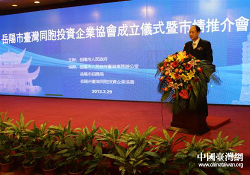 中國臺灣網(wǎng)4月3日岳陽消息 日前,由岳陽市人民政府主辦,市臺辦、市招商局、市臺協(xié)共同承辦的岳陽市臺灣同胞投資企業(yè)協(xié)會成立儀式暨市情推介會在煙波浩淼的洞庭湖畔,氣勢雄偉的岳陽樓下,風景秀美的南湖之濱隆重舉行。臺灣;鶗麻L林中森一行,全國臺企聯(lián)總會長郭山輝、常務(wù)副會長兼秘書長何世忠,國臺辦綜合局副局長、海協(xié)會副秘書長鄭崇陽,省臺辦主任馮波,各地臺協(xié)會長和重要臺商聚集岳陽。