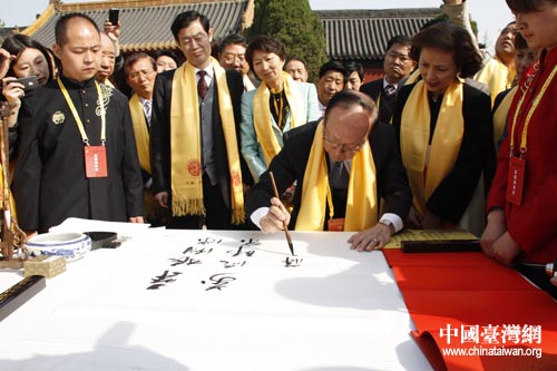 蔣孝嚴(yán)在黃帝故里祠前題詞“尋根溯源 萬(wàn)流歸宗”。(圖片來(lái)源:河南省臺(tái)辦)