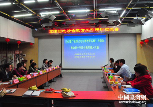 中國(guó)臺(tái)灣網(wǎng)4月23日北京消息 日前,天津市臺(tái)辦宣傳處處長(zhǎng)王金鎖、南開區(qū)臺(tái)辦主任田路明帶領(lǐng)南開區(qū)臺(tái)辦、教委工作人員及天津市三所學(xué)校的領(lǐng)導(dǎo)一行7人到西城區(qū)調(diào)研青少年涉臺(tái)教育工作。北京市臺(tái)辦宣傳處處長(zhǎng)金秀清、西城區(qū)臺(tái)辦主任劉琪、副主任趙玲、教工委統(tǒng)戰(zhàn)部部長(zhǎng)李惠林、區(qū)涉臺(tái)教育基地——少年宮書記孟三豐、主任王小惠等同志參加接待活動(dòng)。