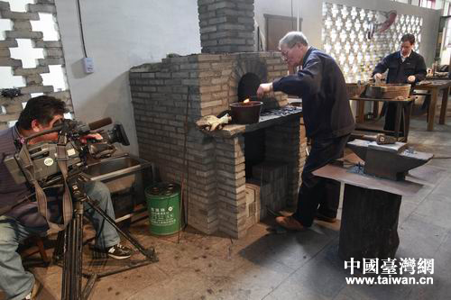 攝制組在橋西手工藝活態(tài)展示館采訪拍攝張小泉剪刀制作的整個(gè)工藝。(圖片來(lái)源:杭州市臺(tái)辦)