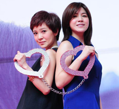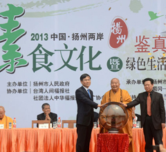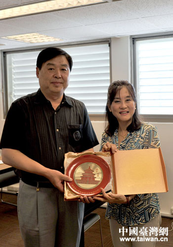北京市臺(tái)辦副主任高振生和臺(tái)中市新聞局局長(zhǎng)石靜文交換禮物。(圖片來(lái)源:第十三屆京味文化之旅交流團(tuán))