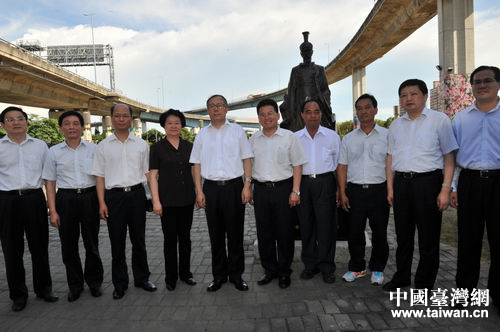 5月30日,代表團(tuán)成員與彰化市屈家村的部分鄉(xiāng)親在屈原銅像前合影。(圖片來源:湖北省臺(tái)辦)