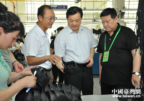 永州市委黨委、市委副市長(zhǎng)易佳良(中),寧遠(yuǎn)縣委書(shū)記嚴(yán)興德(右)在寧遠(yuǎn)臺(tái)資企業(yè)華榮鞋業(yè)總經(jīng)理曾文鋒(左、臺(tái)胞)陪同下參觀生產(chǎn)車(chē)間。(圖片來(lái)源:永州市臺(tái)辦)