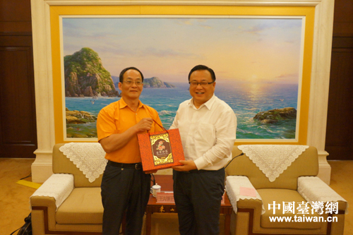 威海市委書記、市人大常委會主任孫述濤(右一)與臺灣兩岸情經(jīng)貿(mào)交流協(xié)會會長王培旺(左一)互贈紀念品。(圖片來源:威海市臺辦)