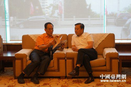 威海市臺辦主任于連波(右一)與臺灣兩岸情經(jīng)貿(mào)交流協(xié)會會長王培旺(左一)親切交談。(圖片來源:威海市臺辦)