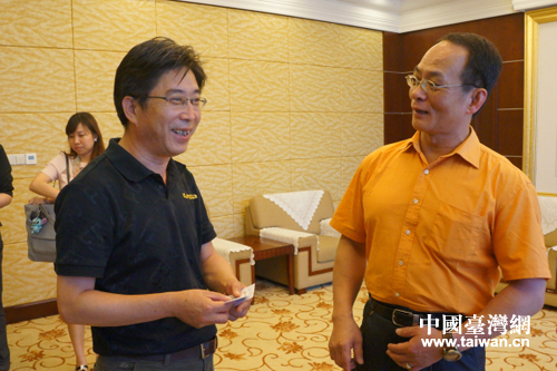威海市臺辦副主任徐恩祿(左一)與臺灣兩岸情經(jīng)貿(mào)交流協(xié)會會長王培旺(右一)交換名片。(圖片來源:威海市臺辦)