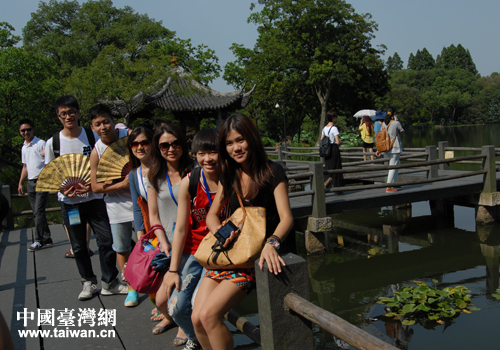 杭州西湖邊,營員們合影留念。(圖片來源:上海市臺聯(lián))