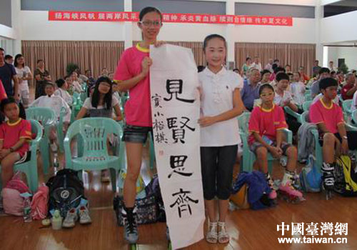 荊門(mén)學(xué)生桂裕祺(右)將書(shū)法作品“見(jiàn)賢思齊”贈(zèng)送臺(tái)灣學(xué)生高瑭淯(左)。(王啟宏 攝)