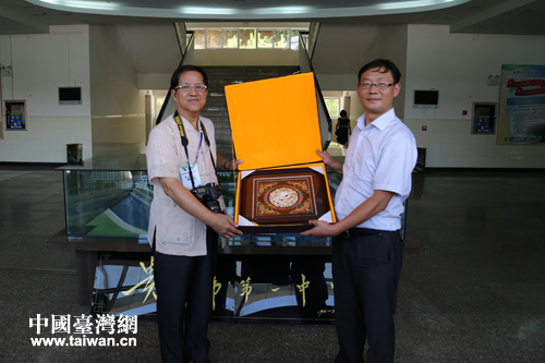 一中副校長(zhǎng)(右一)與臺(tái)北市教育局督學(xué)交換禮品。(圖片來源:貴陽市臺(tái)辦)
