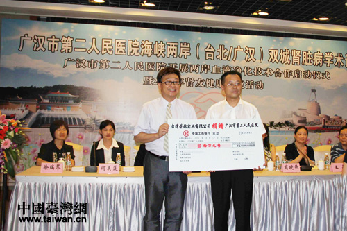 交流會(huì)上,臺(tái)灣專(zhuān)家新光醫(yī)院和上海市臺(tái)商協(xié)會(huì)向廣漢市第二人民醫(yī)院捐贈(zèng)了價(jià)值10萬(wàn)元的血透耗材,同時(shí)舉行了“海峽兩岸血液凈化技術(shù)合作服務(wù)”的啟動(dòng)儀式。