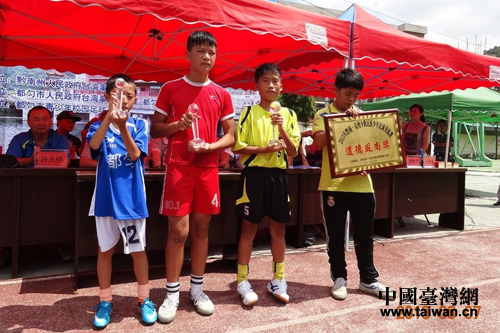 在閉幕式上,黔南州臺辦副主任張榮周作總結(jié)講話:八月正是都勻劍江河畔稻花飄香,在高原橋城都勻市舉行的黔南臺臺灣少數(shù)民族少年足球交流賽,通過各參賽隊員球藝全力的展示,教練員的辛勤呵護,裁判員的公正執(zhí)法,全體觀眾的熱情鼓勵,兩地少年足球隊賽出成績,賽出風格,賽出友誼。在交流賽場上,兩地小朋友交流了感情,互送禮物,結(jié)下了兄弟姐妹般的友情,獲得了雙豐收。應邀臺東教育部門和豐里小學、關(guān)山小學的邀請,都勻市教育部門將在適當時期,組團赴臺東參訪,衷心祝愿臺東、都勻教育交流合作綻放璀璨之花,讓兩地小朋友茁壯成長,為實現(xiàn)中華民族偉大復興夢,添磚加瓦。張榮周最后宣布:黔南、臺灣少數(shù)民族足球交流勝利閉幕。(中國臺灣網(wǎng)黔南州臺辦通訊員 羅世云)