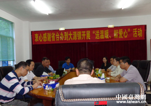 與市、鎮(zhèn)、村干部座談,了解慰問災(zāi)后復(fù)產(chǎn)工作。(圖片來源:廣東省臺辦)