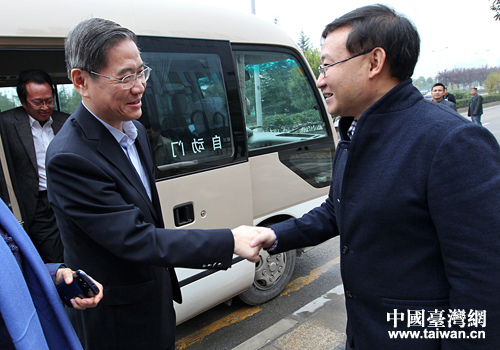 貴陽市委常委、統(tǒng)戰(zhàn)部長帥文(右一)迎接國務(wù)院臺(tái)辦張志軍主任。(當(dāng)代貴州雜志社 傅泊霖 攝)