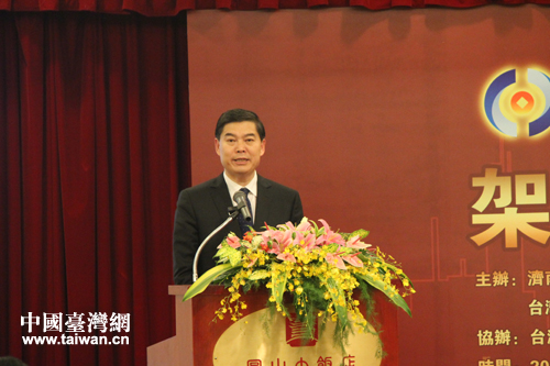 楊魯豫在兩岸金融合作懇談會上致辭推介濟南。(圖片來源:濟南市臺辦)