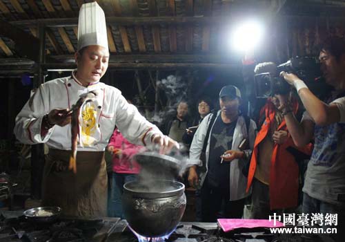 臺灣中時媒體集團采訪組一行采訪拍攝著名的“雅魚”現(xiàn)場烹制。(圖片來源:四川省臺辦)