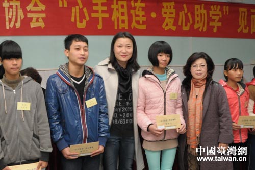 肇慶市臺(tái)商協(xié)會(huì)會(huì)長(zhǎng)黃月美(右三)、市婦聯(lián)主席張麗文(左三)與受資助學(xué)生合影。(圖片來(lái)源:肇慶市臺(tái)辦)