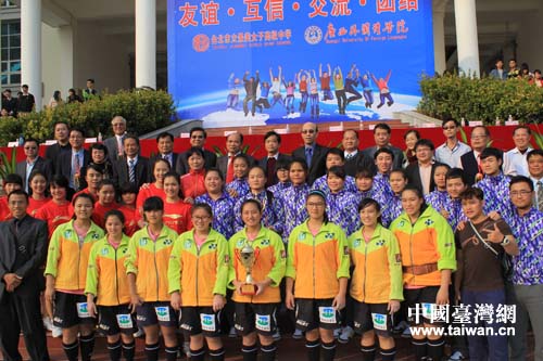 本次友誼賽以“友誼·互信·交流·團(tuán)結(jié)”為主題,由廣西桂臺(tái)經(jīng)濟(jì)科技文化交流協(xié)會(huì)和臺(tái)灣中華運(yùn)動(dòng)傳播學(xué)會(huì)共同主辦,分別在廣西外國(guó)語(yǔ)學(xué)院和廣西師范大學(xué)舉行。臺(tái)灣中華運(yùn)動(dòng)傳播學(xué)會(huì)表示,在拔河友誼賽中獲勝的廣西隊(duì)伍,將有機(jī)會(huì)獲得免費(fèi)寶島7日游。當(dāng)天,臺(tái)北景美女中拔河隊(duì)還參與背簍繡球、高桿繡球、板鞋等廣西民族傳統(tǒng)體育活動(dòng)交流,通過(guò)賽場(chǎng)內(nèi)外交流,桂臺(tái)兩地青少年收獲了滿滿的“友誼”。此外,臺(tái)北景美女中還與廣西外國(guó)語(yǔ)學(xué)院簽訂了文化、體育、教育交流合作備忘錄。