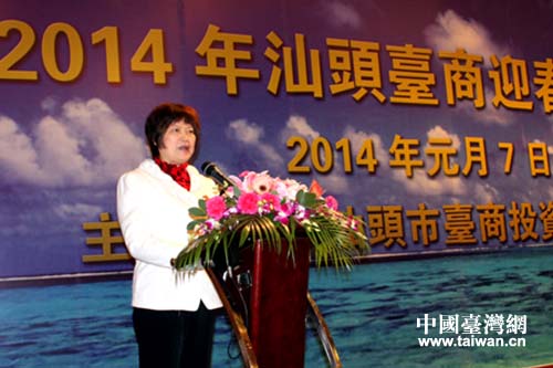 汕頭市政協(xié)副主席蔡嬋英在2014年汕頭臺(tái)商迎春聯(lián)誼會(huì)上致辭。(圖片來(lái)源:汕頭市臺(tái)辦)
