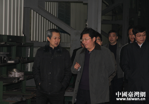 曹曉武一行(左)在淄博市臺辦主任王秀輝陪同下視察臺資企業(yè)山東國弘重工機械有限公司。(圖片來源:淄博市臺辦)