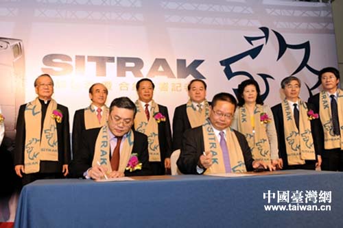 山東省委常委顏世元率文化經(jīng)貿(mào)交流團(tuán)在臺(tái)北出席中國(guó)重汽集團(tuán)與臺(tái)灣大益興業(yè)公司生產(chǎn)技術(shù)合作簽約儀式。(圖片來(lái)源:山東省臺(tái)辦)