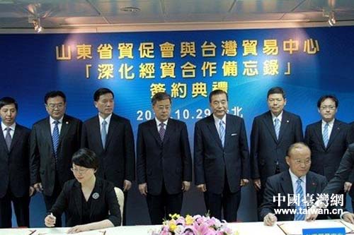 山東省委副書(shū)記、省長(zhǎng)郭樹(shù)清等在臺(tái)北出席山東省貿(mào)促會(huì)與臺(tái)灣貿(mào)易中心“深化經(jīng)貿(mào)合作備忘錄”簽約儀式。(圖片來(lái)源:山東省臺(tái)辦)