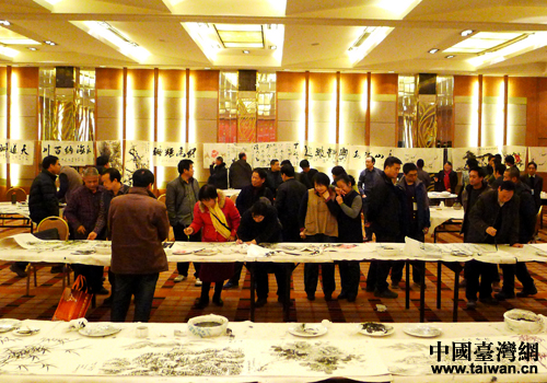 活動現(xiàn)場,書畫名家激情揮墨,為本屆書畫展創(chuàng)作參展作品。張劍波先生創(chuàng)作、趙振川題跋的丈二尺的山水畫《黃河頌歌》,寓意“母親養(yǎng)育情,海峽兩岸頌,匯聚正能量,實現(xiàn)中國夢”,在現(xiàn)場引起強烈震動,把活動推向高潮。